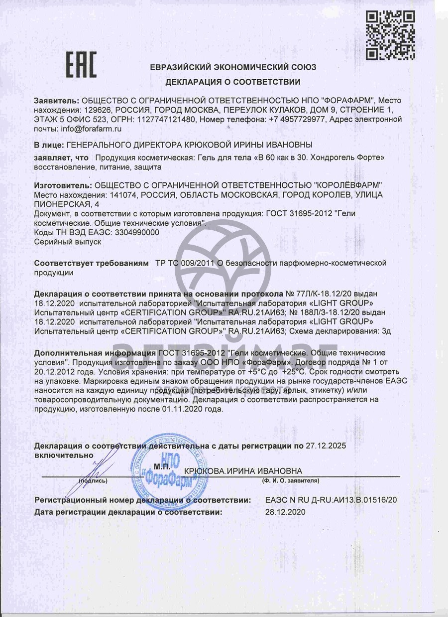Гель для тела В 60 как в 30. Хондрогель Форте восстановление, питание, защита эффективное средство, разработанное совместно Королёвфарм и НПО Космическая реабилитационная медицина специально для предотвращения преждевременных и возрастных дегенеративно дистрофических процессов, а также для активного обновления. Способствует нормализации функционального состояния и увеличения гибкости.